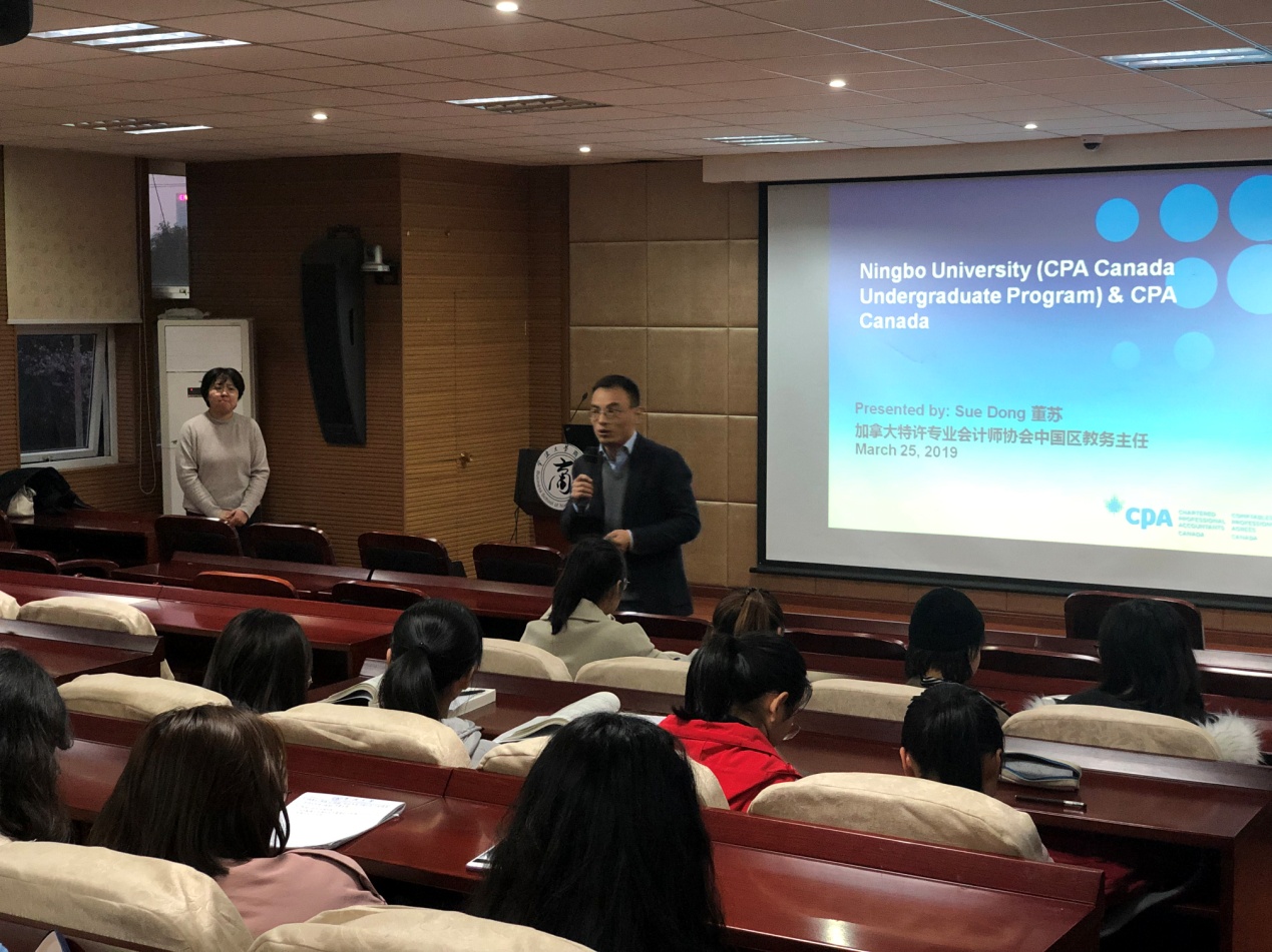 2019年3月25日晚6点,加拿大特许专业会计师协会(简称:CPA Canada)中国区教育主任董苏女士携协会资深会员——加拿大税务局官员Lesley一行专程来访国产av影片 ,与CPA Canada专业大一至大三中外学生在学院109报告厅见面交流。交流会由盛沛锋副院长主持。