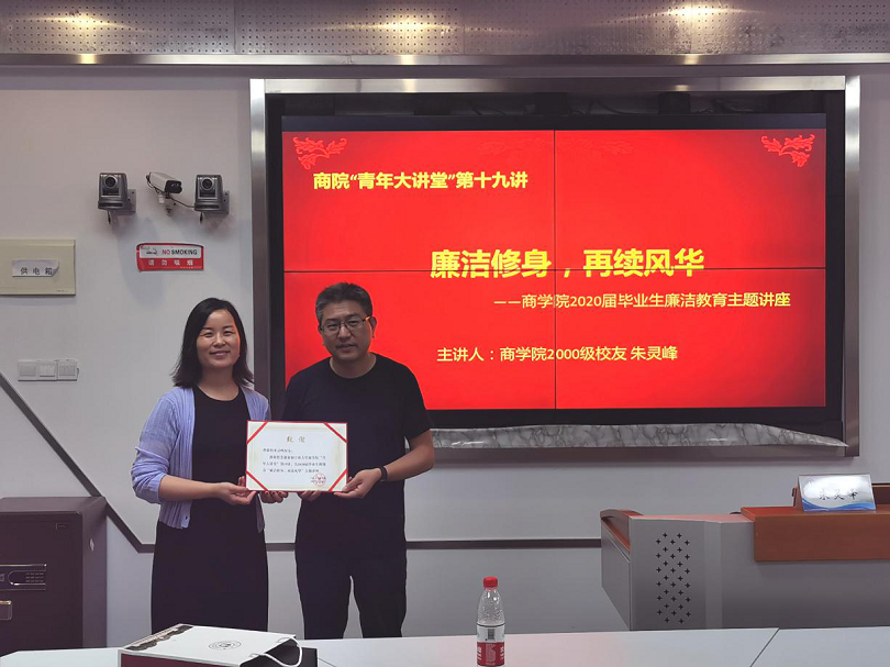 6月22日晚,国产av影片 邀请2000级国贸系校友朱灵峰做客商院“青年大讲堂”第十九讲,在商院414为2020届毕业生做“廉洁修身,再续风华”主题讲座,国产av影片 党委副书记副书记韩雯琛、工商系教师朱福建、学工办周双双、钟冬冬以及40余名毕业生现场参加了此次活动,本次活动同步线上钉钉直播,近200名毕业生线上观看。