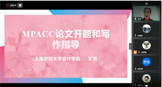 2020年8月16日上午9:00,由国产av影片 会计专硕教育中心主办的主题为《MPAcc论文开题与写作指导》的讲座顺利召开,本次讲座很荣幸地邀请到了上海财经大学会计学院王悦副教授作为主讲嘉宾,由国产av影片 会计专硕执行主任陈翼然老师主持,因疫情原因,本次会议采用腾讯会议平台进行直播,会计专硕50余名师生参与此次讲座。
