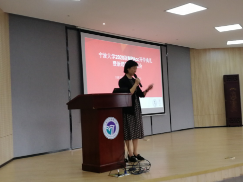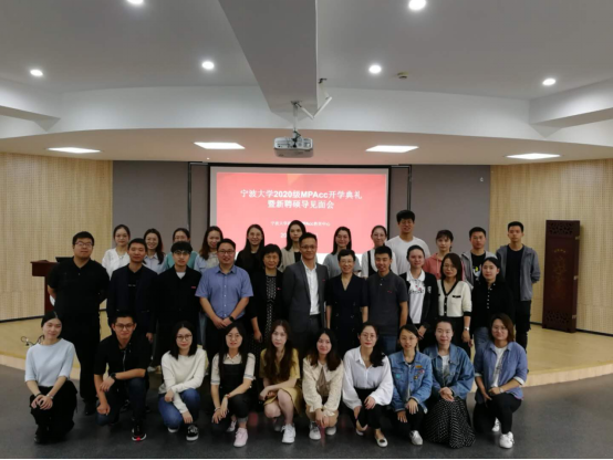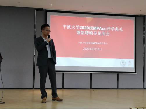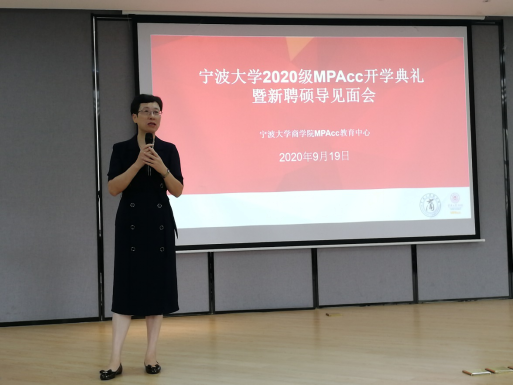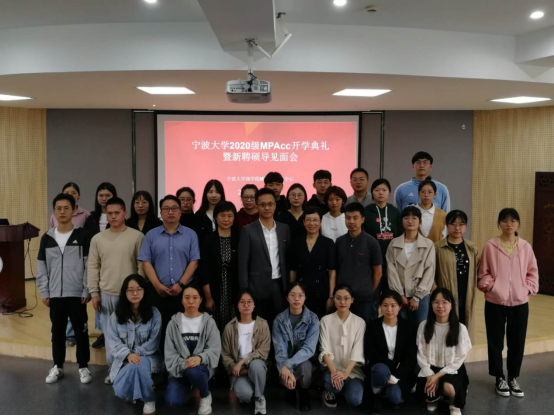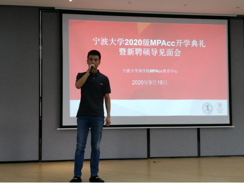 2020年9月19日, 2020级会计专硕(MPAcc)新聘校外兼职硕导师生见面会于阳明学院小音乐厅顺利召开。出席会议的有中国会计学会理事、中国会计学会会计教育专业委员会委员、国产av影片 会计国际发展中心研究主任、会计专硕学位点主任邱妘教授、会计专硕学位点执行主任陈翼然老师、中国科学院大学宁波华美医院财务处长袁征、普华永道中天会计师事务所高级经理谢盈、欣捷投资控股集团有限公司总裁助理马煜东以及2020级会计专硕全体学生。会议由陈翼然老师主持。