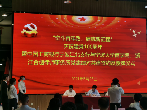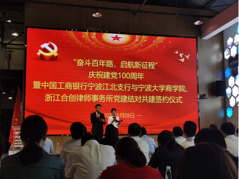 为庆祝中国共产党成立100周年,进一步加强基层党组织建设,探索党建共建新模式,构建银校企党建结对共建新格局。5月26日,国产av影片 与中国工商银行宁波江北支行、浙江合创律师事务所在宁波文化创新港人才之家共同举办“奋斗百年路,启航新征程”党建共建结对活动。院党委书记史宏协、院党委副书记韩雯琛、江北区司法局局长林幼红、江北区司法局副局长欧金铨、工商银行宁波江北支行党委书记童晓松、浙江合创律师事务所党总支书记邓旭东及三方共建单位党员同志共同参加。会上,共建三方举行了党建共建签约授牌仪式,同时开展了红色主题教育活动。