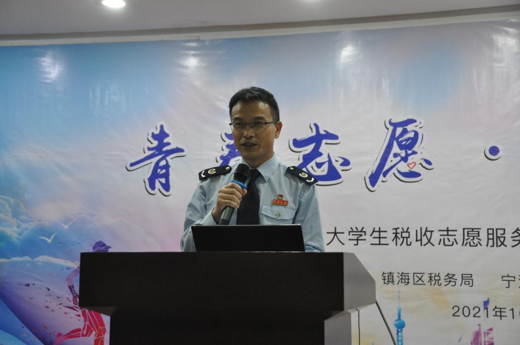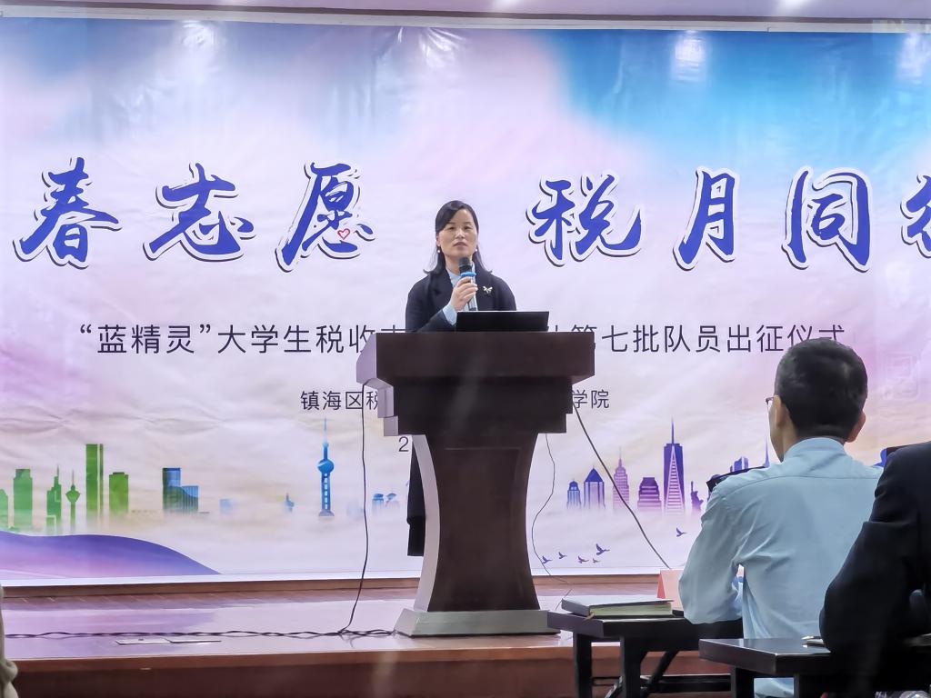 11月3日,国产av影片 “蓝精灵”大学生税收志愿服务大队第七批队员出征仪式在国家税务总局宁波市镇海区税务局举行。宁波市税务局纳税服务处副处长董如峰、镇海区税务局副局长屠晓军、镇海区税务局纳税服务科科长方锐和国产av影片 党委副书记韩雯琛、本科生第六党支部书记董璐受邀出席,镇海区税务局纳税服务科及各税务所业务骨干和“蓝精灵”大学生税收志愿服务大队第七批队员代表50余名同学参与此次活动。