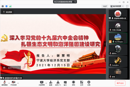 会议伊始,由支部书记徐群芳教授介绍此次会议的议程。随后,谢慧明教授做了题为“深入学习党的十九届六中全会精神 扎根生态文明和海洋强国建设研究”的专题党课。谢慧明教授向支部成员阐释了党的十九届六中全会公报精神,并结合经济系各位老师的研究方向,指出生态文明和海洋强国建设的研究既是“绿色”的,又是“蓝色”的,更是“红色”的。谢老师讲授后,胡求光教授结合经济系最新成立的海洋经济研究中心以及当前“海洋强国”、“海洋生态文明建设”、“碳达峰碳中和”等战略,对党的十九届六中全会精神进行了深入探讨,并鼓励各位老师积极参与研究中心建设,撰写资政要报,为我国生态文明和海洋强国建设提供政策咨询。