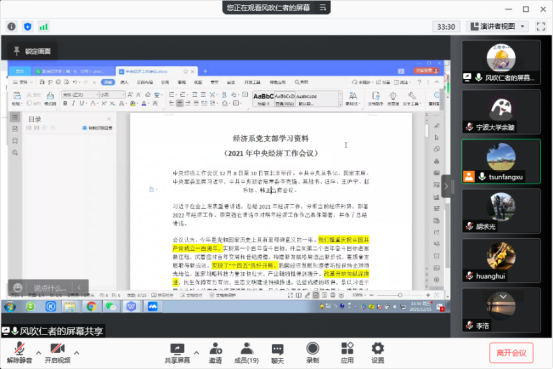 12月15日下午13:30,经济系教师党支部组织召开了支部专题学习会,针对2021年中央经济工作会议精神进行专题学习。受新一波新冠疫情的影响,此次会议通过腾讯会议线上平台举行。