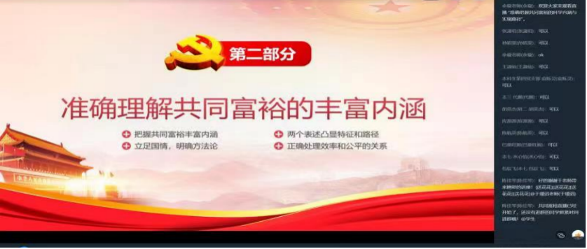 在随之而来的《共同富裕》课程中,余璇首先就共同富裕是社会主义的本质要求展开,引出共同富裕的科学内涵和实现路径。余璇紧扣习近平总书记重要讲话中关于共同富裕的两个表述,提到共同富裕是“中国式现代化的重要特征”和“在高质量发展中促进共同富裕”。