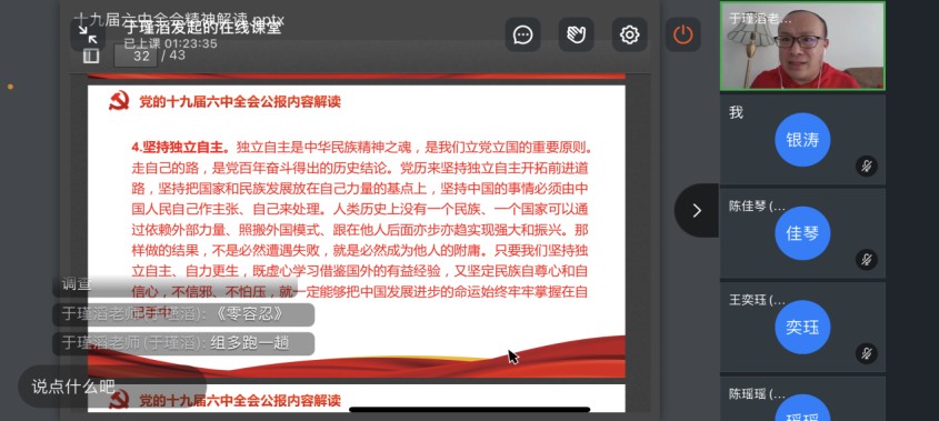 4月20日,国产av影片 党委分党校第46期预备党员培训班于线上举办了主题为《十九届六中全会精神解读》和《共同富裕》的党校课程。本次党课分别邀请会计系教师于瑾滔和经济系教师余璇担任主讲老师,学院第46期预备党员培训班全体学员参加。