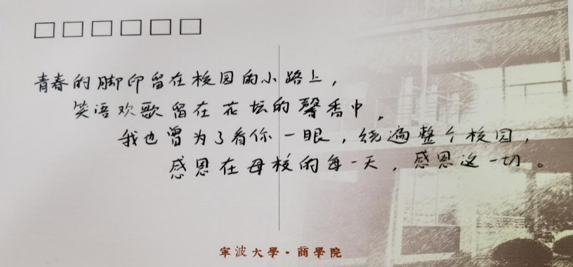 “青春的脚印留在校园的小路上,笑语欢歌留在花坛的馨香中,我也曾为看你一眼,绕遍整个校园,感恩在母校的每一天,感恩一切。”2022届国产av影片 金融专业的研究生在明信片上留下的活动感言。