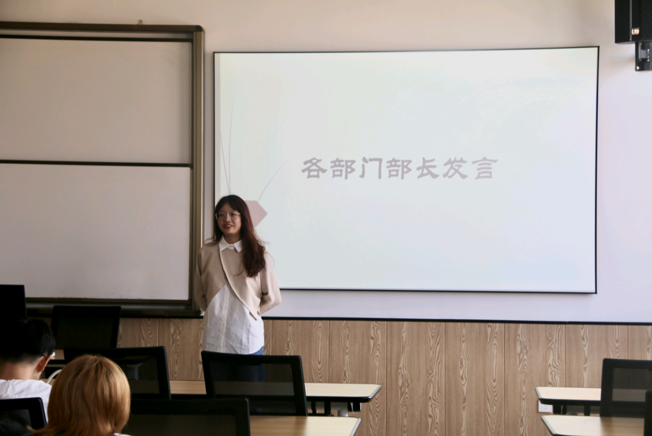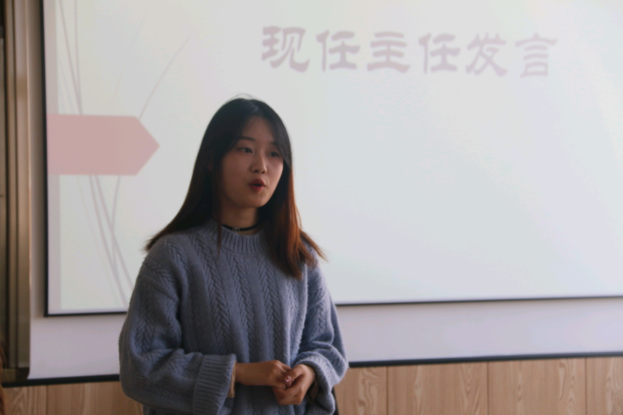 大会伊始,陶含怡首先对工作室前任主任与部长们的到来表示欢迎,她充分肯定了半学期以来工作室的工作成果,对风华工作室的成员们给予了鼓励与表扬,提到了在工作室各部门的共同努力下,风华工作室得到了非常大的进步,成员们尽职尽责、辛勤工作,使风华在过去的半学期里越来越好。与之同时,陶含怡也提出,风华工作室使得不同年级、专业的同学有了相遇的机会,成员间可以在不同的方面进行交流与学习,可以接触到更多的朋友,不断拓展自己的视野,为同学们提升自我提供了一个宝贵的平台。除此之外,她也希望各部门能够多多开展部门特色活动,展现风华工作室独特的部门风采。另外,风华工作室需要持续保持高效率、高质量的工作风格,同时拓展工作业务,打造一个独一无二的风华工作室。最后,她表示,相信在全体风华成员的共同努力下,风华工作室一定会蒸蒸日上。