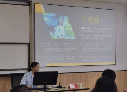 2022年9月21日,国产av影片 在曹光彪楼422研讨室举行学术讲座,新引进的优秀博士牛婉姝教师作了题为“Spanning from diagnosticity to serendipity: An empirical investigation of consumer responses to product presentation”的学术报告,报告由曾守桢教授主持,国产av影片 师生40余人参加。