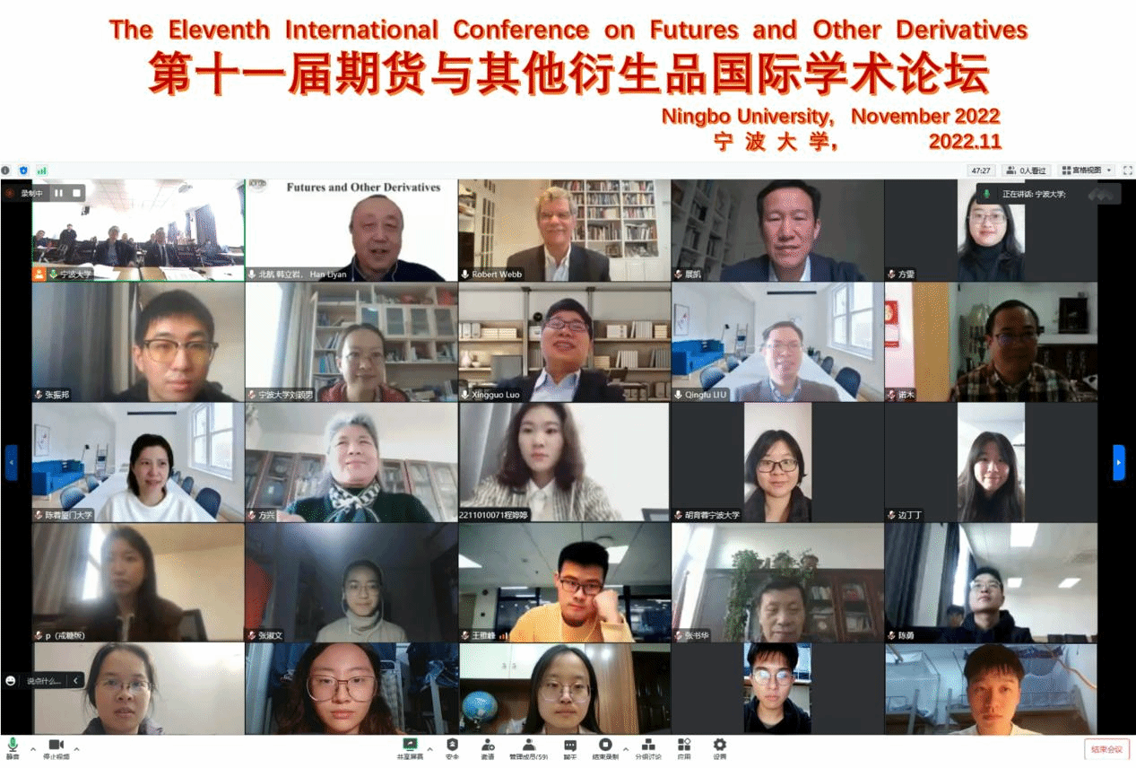2022年11月5日至6日,第十一届期货与其他衍生品国际学术论坛在国产av影片 以线上与现场的混合模式顺利举行。 会议由国产av影片 主办,国产av影片 、国产av影片 可持续金融研究中心和(浙江省新型智库)国产av影片 中东欧经贸合作研究院共同承办。国产av影片 盛沛锋副院长出席开幕式并致欢迎辞,美国弗吉尼亚大学Robert Webb教授及厦门大学陈蓉教授作精彩的大会主旨演讲。国产av影片 可持续金融国际研究中心主任章勇敏教授与北京航空航天大学的韩立岩教授担任本次论坛的共同主席,并主持了欢迎仪式及大会主论坛。