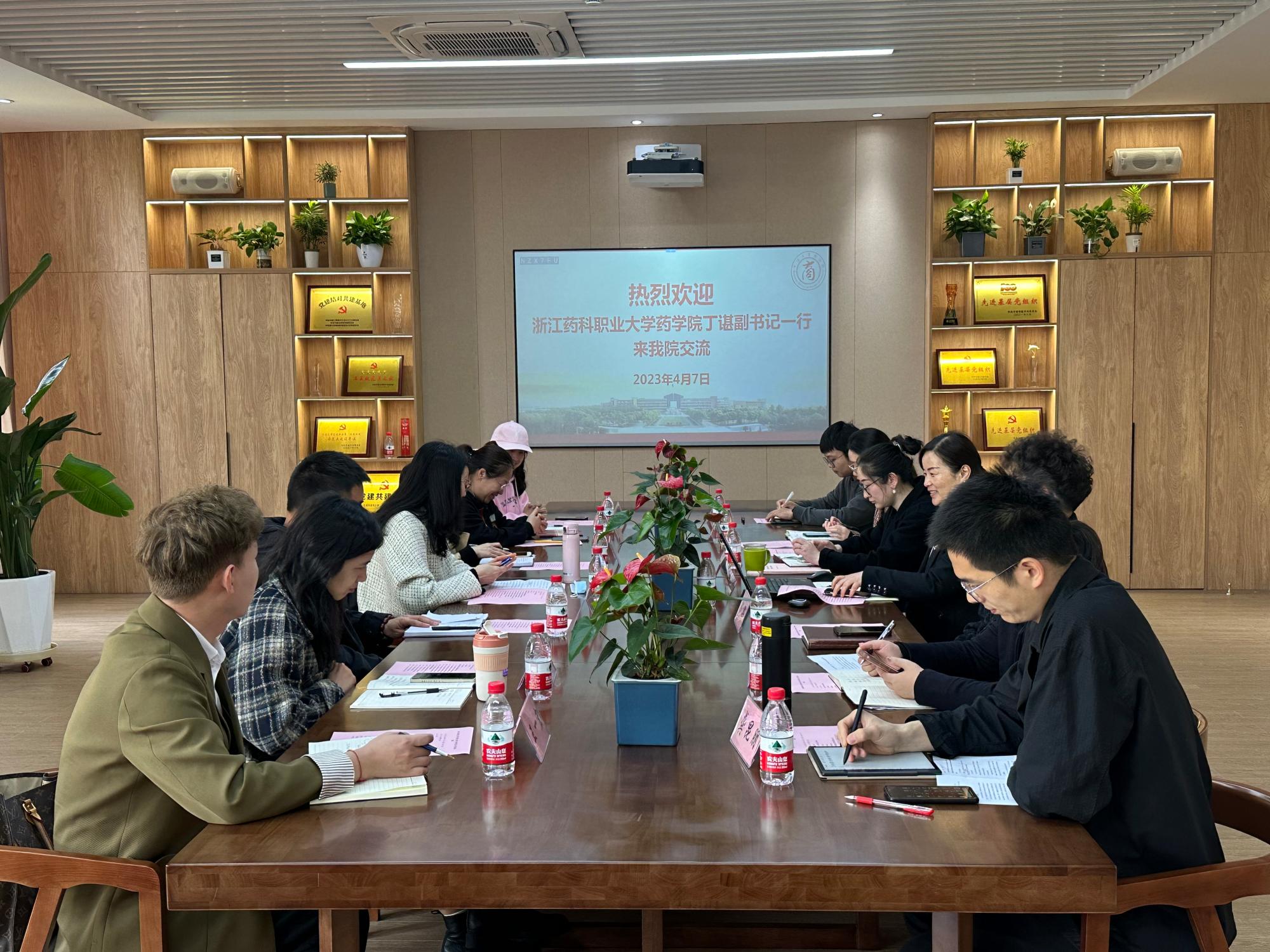 4月7日上午,浙江药科职业大学药学院党委副书记丁谌、学工秘书王婷一行7人来国产av影片 调研学生工作的经验做法。国产av影片 党委副书记韩雯琛、学工办主任陈彬、学工办辅导员周双双、孙健维、陶含怡、龚昆朋、钟冬冬出席接待。