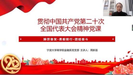 11月30日,金融系教师党支部召开主题党日活动,专题学习党的二十大精神。人文社科处处长周新苗教授以《贯彻中国共产党第二十次全国代表大会精神》为主题上党课,金融系教师党支部21位党员同志参加了学习会。因疫情原因,学习会采取线上形式进行。