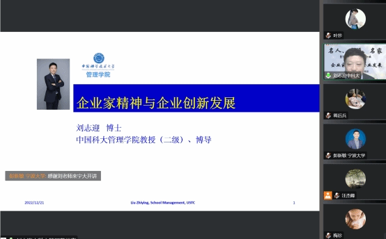 2022年12月21日晚上,我校“名人、名师、名家”暨MBA第四十七期论坛在线上成功举行。本次论坛演讲嘉宾为中国科学技术大学管理学院刘志迎教授,主题为《企业家精神与企业发展》。对此主题感兴趣的教职工、历届MBA校友及2022级全体MBA学员240余人参与本次论坛。