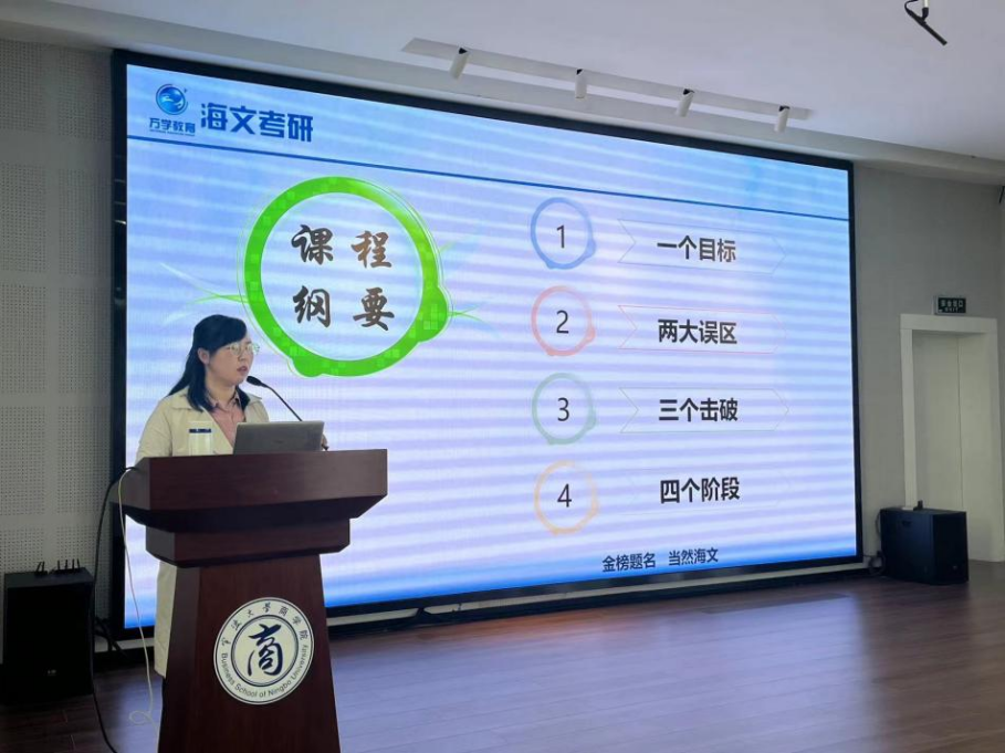 首先,冯老师从考研英语的关键时间节点出发,引出“一个目标”“两大误区”“三个击破”“四个阶段”四个大方面,给同学们详细讲解了考研英语的注意事项与时间规划。紧接着,冯老师着重介绍了“三个击破”——破词、破句、破段/篇。针对如何记单词,提出了词根词缀法,告诉同学们记忆核心词汇时要掌握正确高效的方法;针对如何破句,提出12字口诀,掌握语法结构;针对如何破段与篇,介绍了五种题型方法。最后,冯老师重点解读了考研英语复习规划与时间点,提醒同学们要合理分配复习时间,掌握科学的复习备考方法,并向同学们分享相关复习资料。