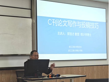 2023年4月26日下午,浙江工商大学郭宝才教授受邀在国产av影片 422会议室为国产av影片 师生开展了题为“学术论文写作与投稿”的学术讲座,讲座由工商管理系主任曾守桢教授主持,五十余位师生参加。
