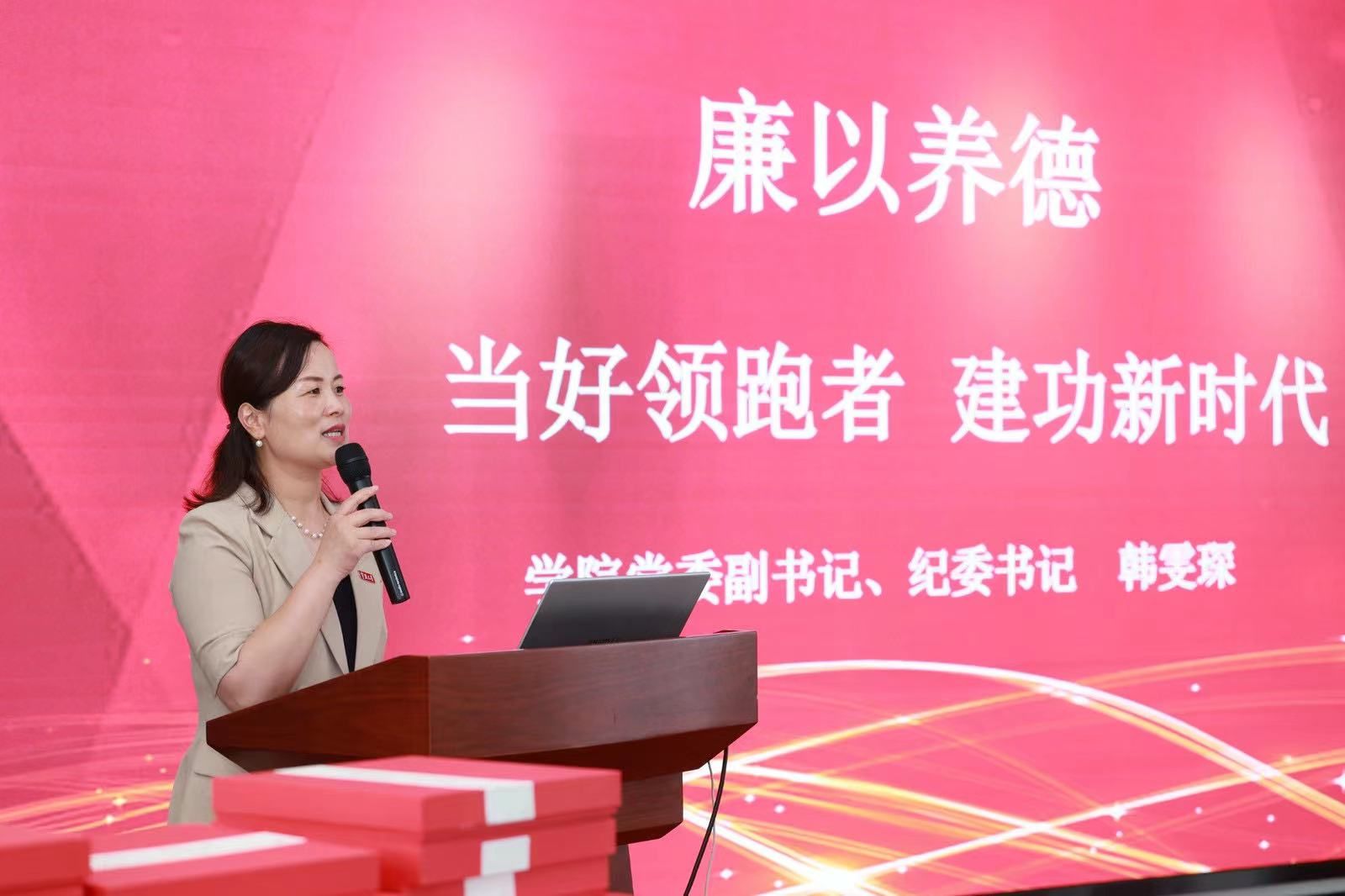 最后,国产av影片 党委副书记、纪委书记韩雯琛为毕业生上题为“廉以养德,当好领跑者,建功新时代”的廉洁教育党课。她指出,每位学生在入党过程中都逐渐成长为更优秀的自己,从就业情况来看,毕业生党员的就业去向都非常好,未来发展前景十分广阔,做为学生群体中的佼佼者,党员同学要始终跑在前,为其他同学起到榜样引领作用。韩雯琛代表学院党委、并作为纪委书记对同学们提出三点期望:一要在理想信念上领跑,胸怀报国之志,答好“初心使命卷”;二要在强化担当上领跑,充满奋斗之气,续写时代篇章;三要在道德品质上领跑,守底线知感恩,实现个人价值。