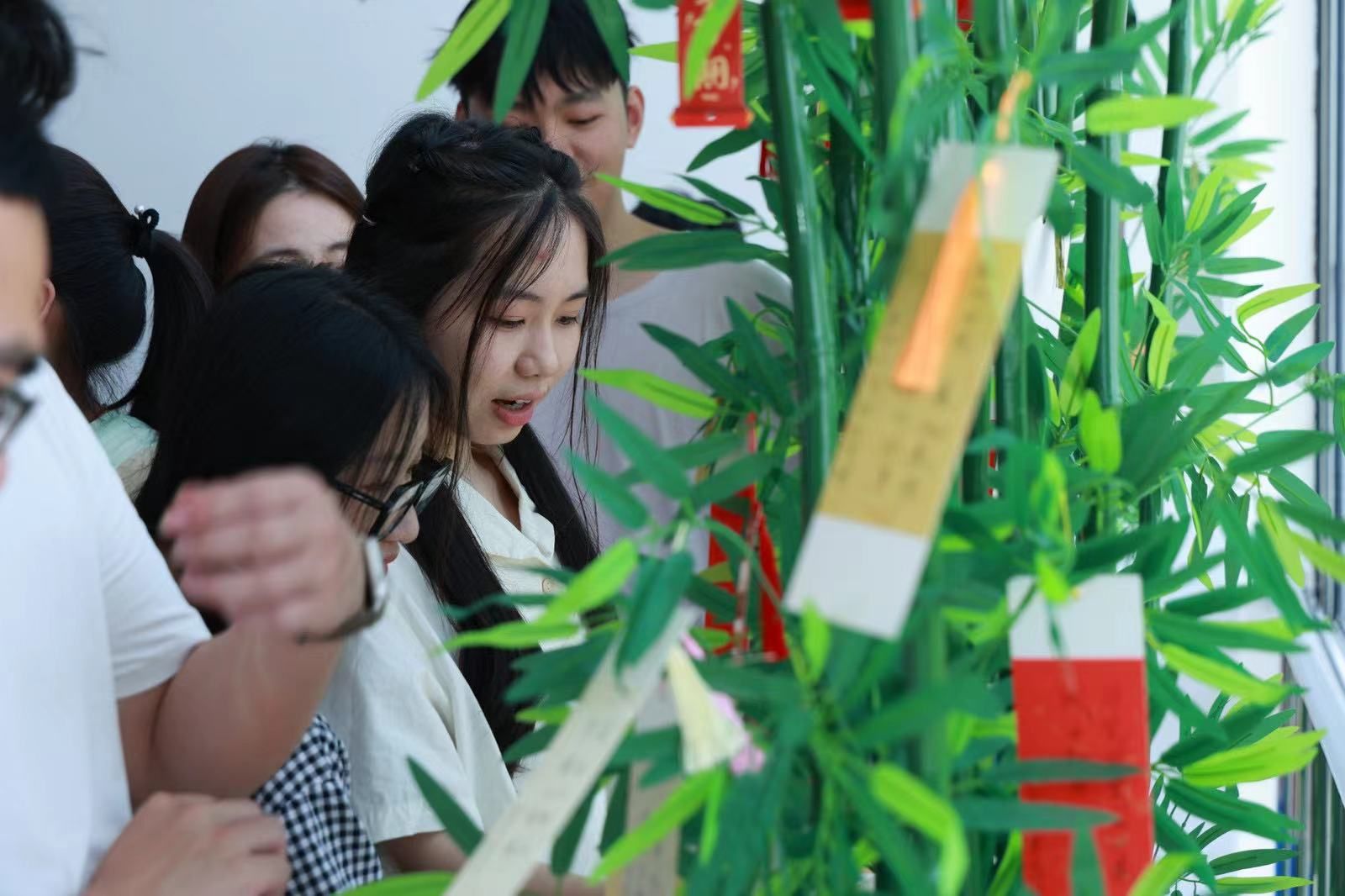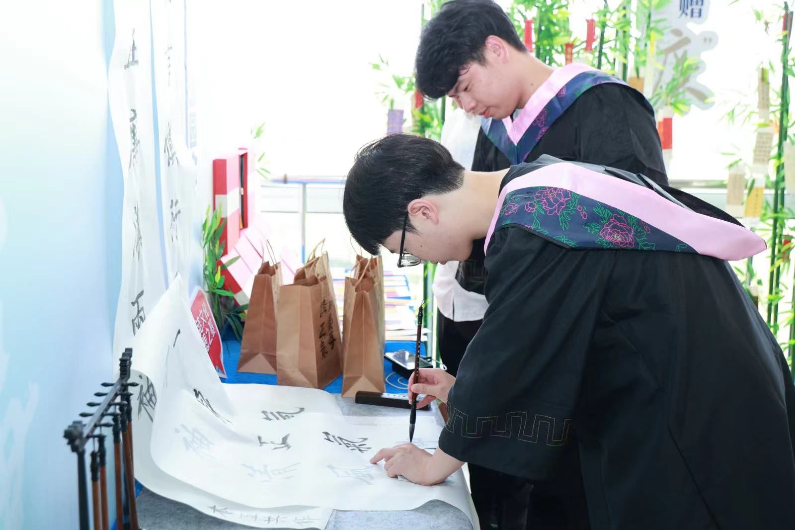 师长赠“廉”,竹叶上挂满了廉洁书签,毕业生党员任意挑选,领取收藏。