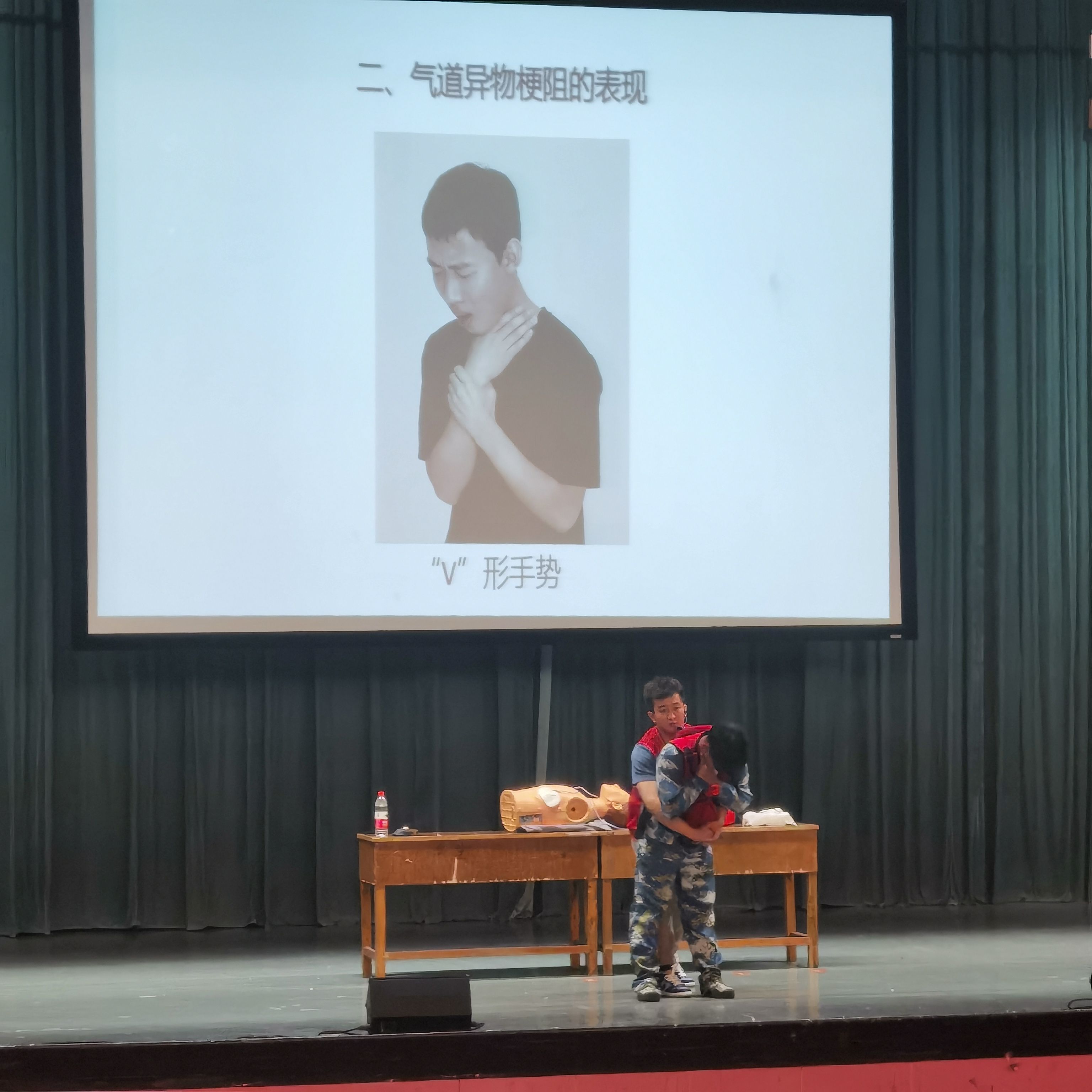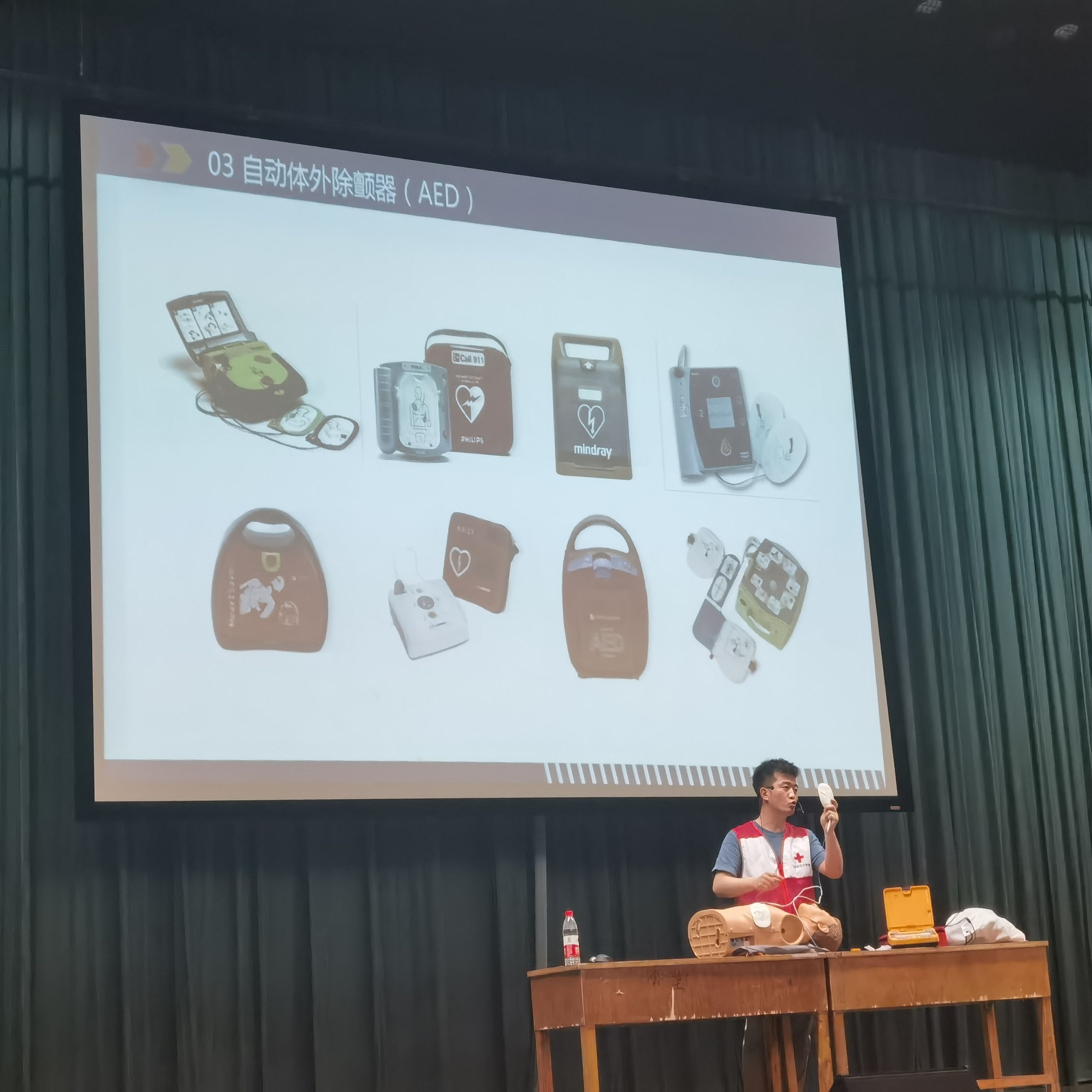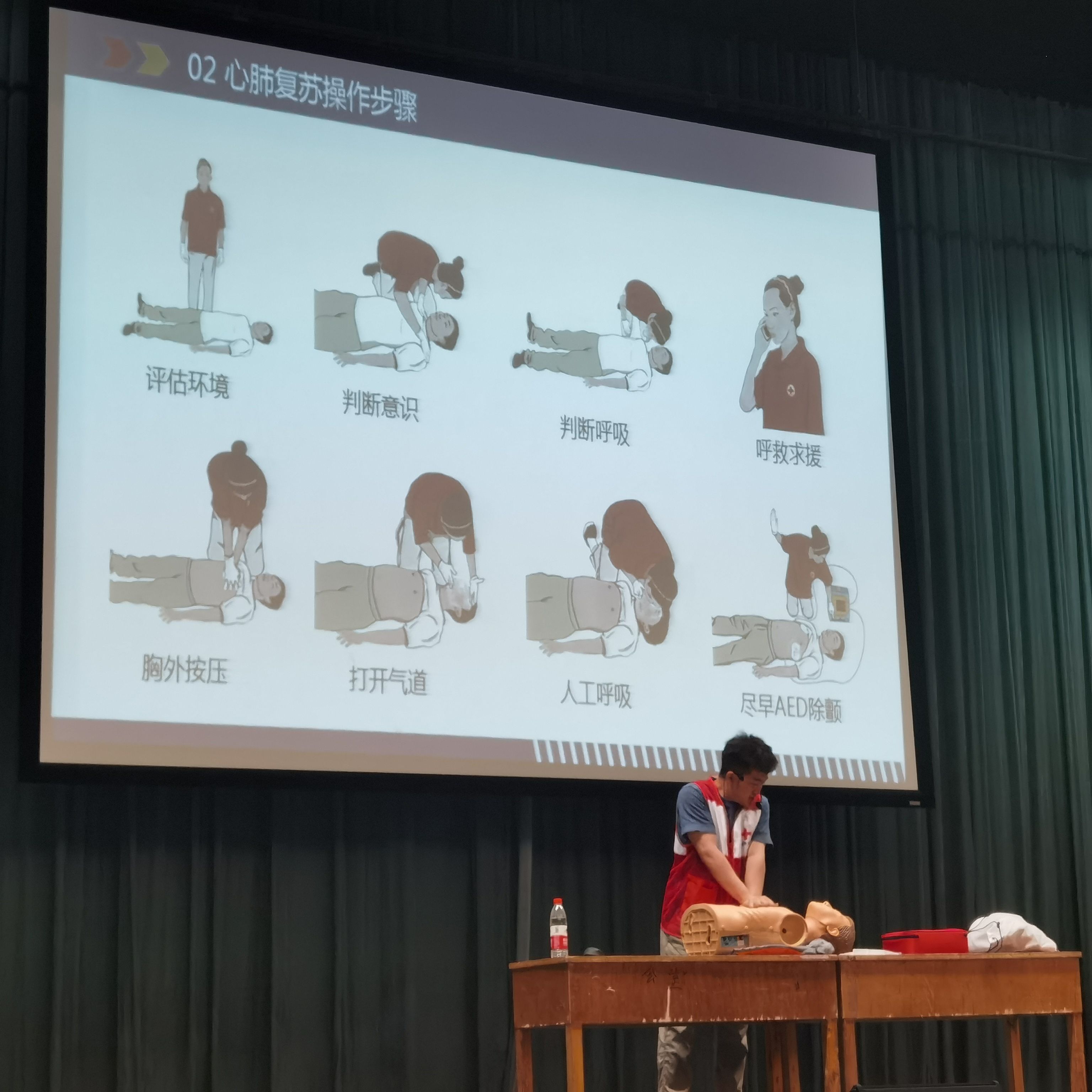本次讲座主要分为急救知识和实践演练这两个环节。活动中,陈阳用生动形象的视频,为学生们讲解了一些常见的突发情况,例如中暑的原因和应对。用幽默诙谐的培训语言让大家明白了应急救护的重要性。之后他通过实物展示、亲身示范等形式,向同学们讲授心肺复苏和AED(自动体外除颤器)的操作原则和方法。讲解中,他用一些通俗、易于牢记的语句让同学们更快的掌握相关知识。最后陈阳通过生活实例、动态照片为大家介绍了气道异物梗阻的原因,并请学生上台进行亲自演示,讲授了腹部冲击法的自救与他救。