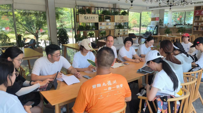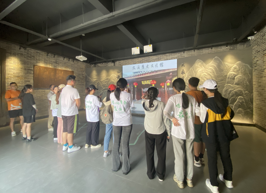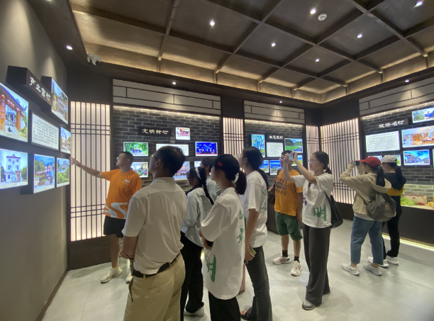 秦山村毗邻风景名胜地——九龙湖,是旅游乡村的典型。接待我们的是秦山村负责文旅工作的张老师。张老师耐心讲解,带领实践队伍参观了旅游接待中心、书吧、博物馆、秦山村文化礼堂等地。