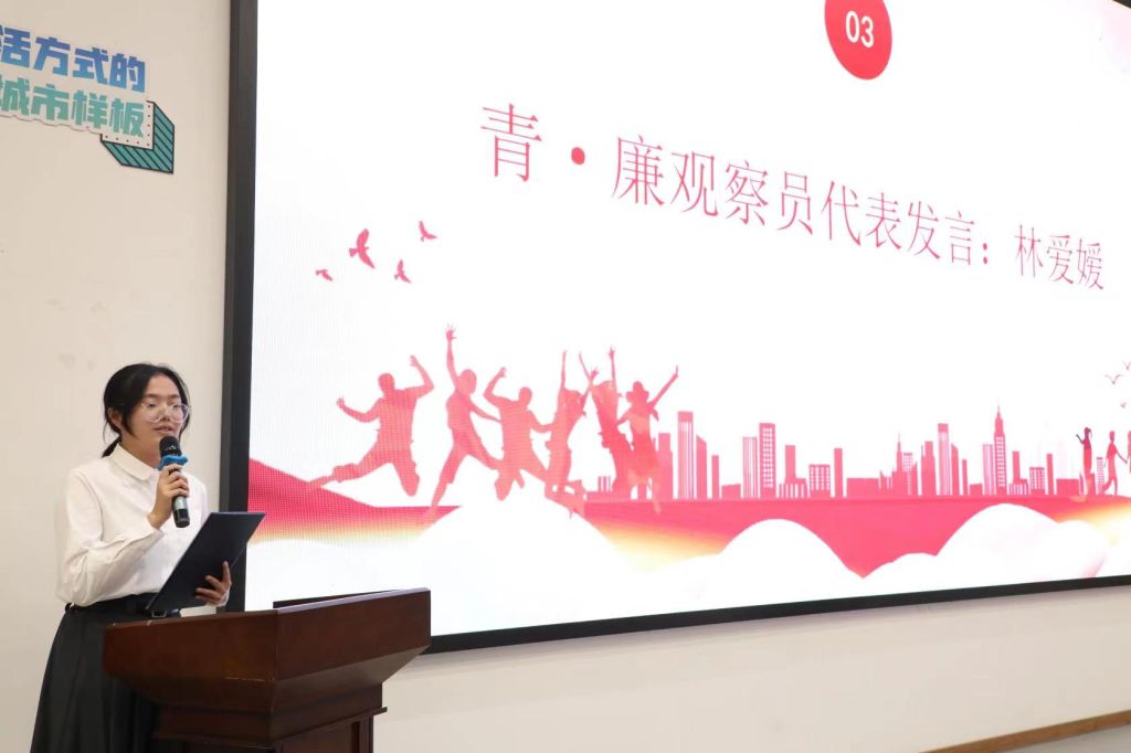 国产av影片 本科生第三党支部的林爱嫒同学作为“青·廉观察员”代表发言,她表示很荣幸能成为“青·廉观察员”里的一员,之后将会积极配合小镇做好监督检查工作,为维护小镇清廉文明的健康生态圈,提出自己的意见建议,为清廉商院、青·廉小镇建设贡献自己的智慧与力量。