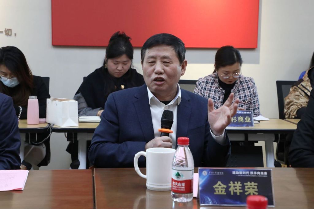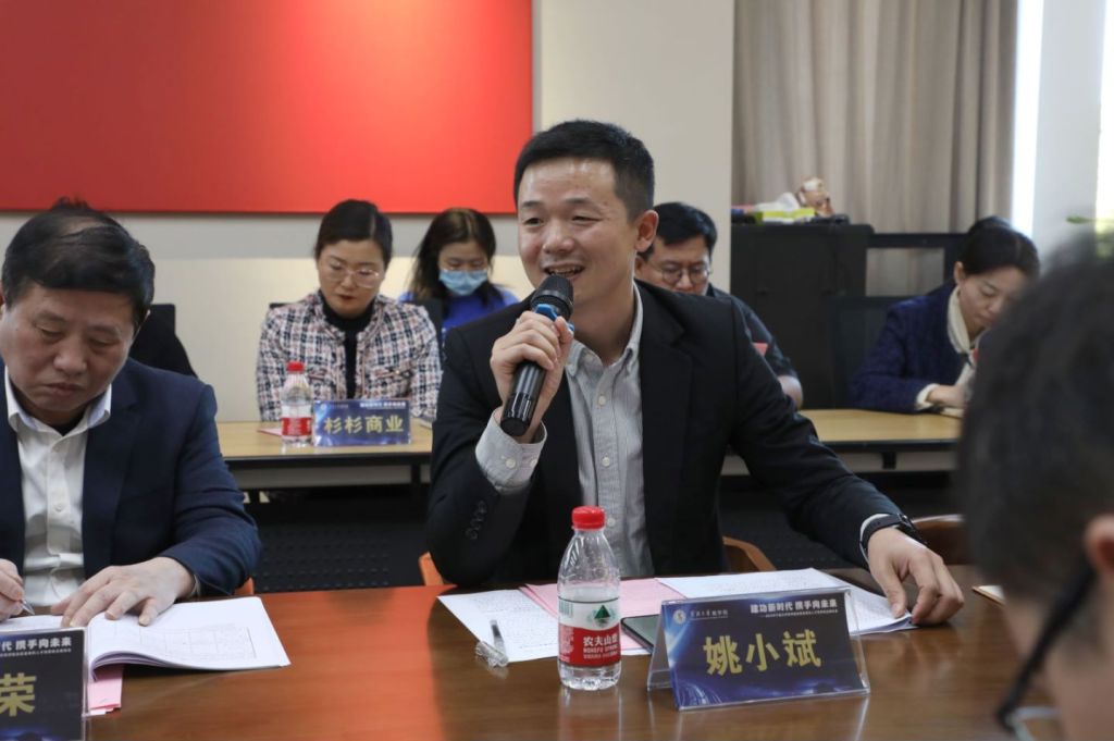 为推进学生高质量就业,11月21日下午,国产av影片 在国产av影片 212会议室举行“建功新时代,携手向未来”高质量商科人才培养校企座谈会,有24家企业代表受邀前来,国产av影片 学生发展与服务处副处长姚小斌、国产av影片 院长金祥荣、党委书记史宏协、党委副书记韩雯琛、副院长彭新敏、国贸教学系主任周艳、金融教学系主任贺翔、工商教学系主任陈士慧、会计教学系主任赵利娟参加了座谈会,座谈会由学院党委副书记韩雯琛主持。