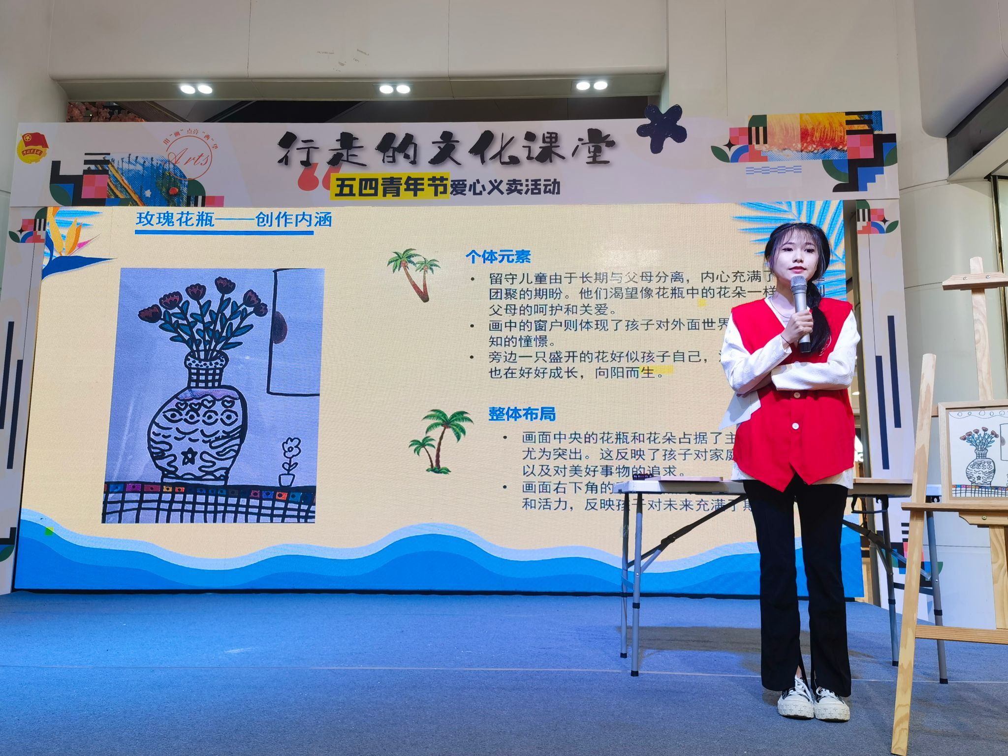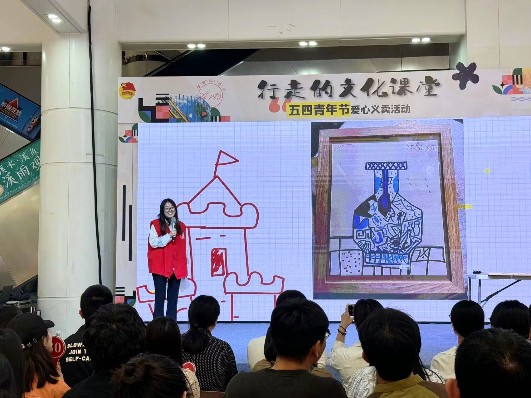 色彩交错的“霍比特房”、俏皮可爱的“小怪兽”、清新素雅的“宝特瓶”······5月8日下午,国产av影片 《行走的文化课堂》五四爱心绘画作品义卖活动在宁波市奉化区银泰城火热举行,青年志愿者们穿上特色红马甲热情推销,有的激情演说招揽顾客,吸引众多家长和市民驻足购买。