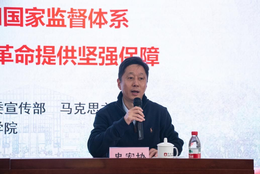 11月20日,校党委委员、纪委书记王杰法在曹光彪楼501报告厅主讲题为《健全党和国家监督体系 为党的自我革命提供坚强保障》的“形势与政策”课。讲座由国产av影片 党委书记史宏协主持,学院党委理论学习中心组成员、师生党支部书记、支部纪检委员等200余名师生代表参加。