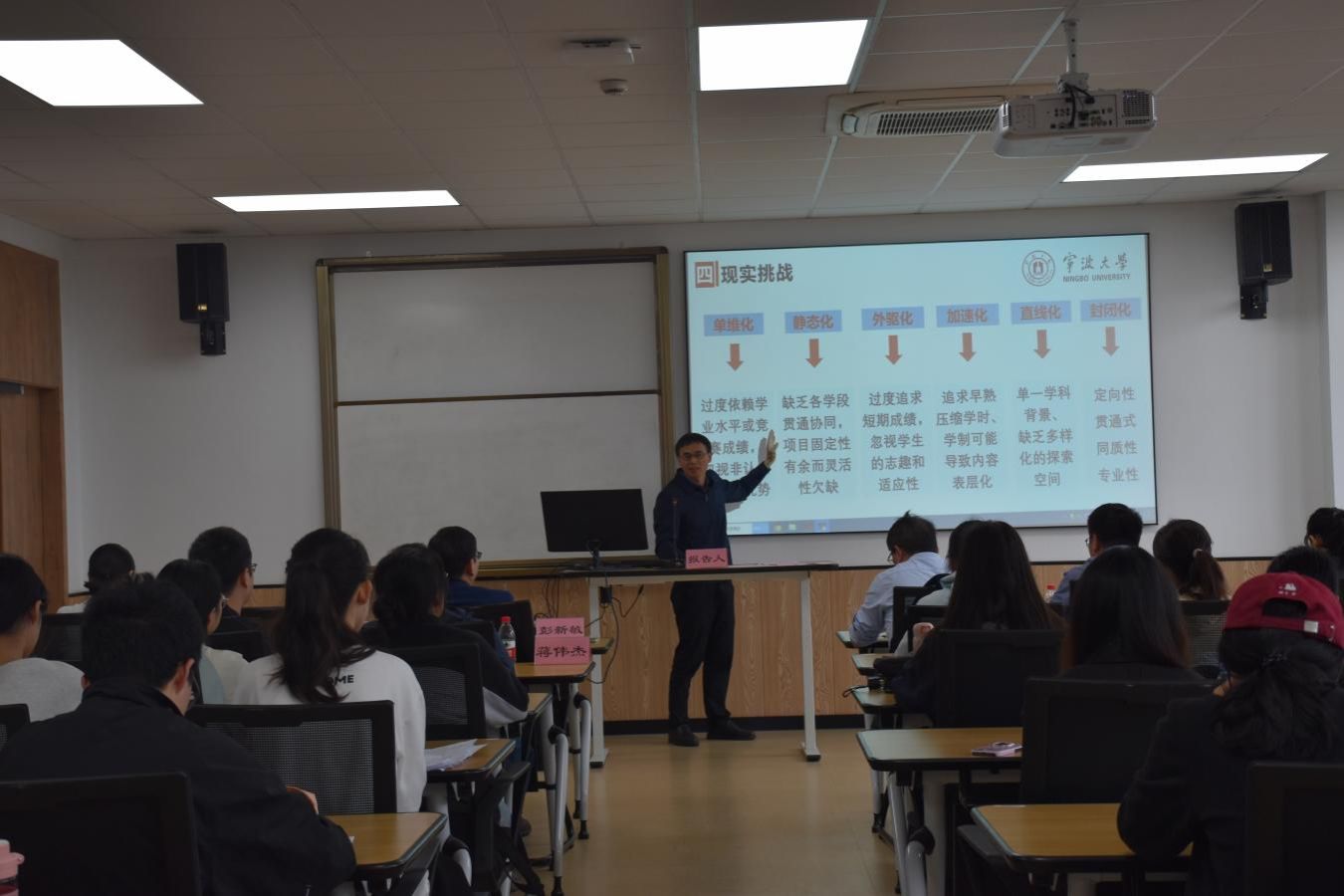 周国平副处长首先对选拔进入商创班学习的同学们表示热烈的祝贺。他结合自己的学习和工作经历,为大家做了一场有关拔尖创新人才选拔与培养的主题报告,从背景、内涵、特征、挑战与优化路径等多个方面进行了详细阐述,鼓励同学们秉持强烈使命感、坚定的志趣、独立的人格、开放的品位,努力学习,成为新时代的商科精英。他的发言不仅为同学们指明了学习的方向,更激发了大家追求卓越、勇攀高峰的决心。