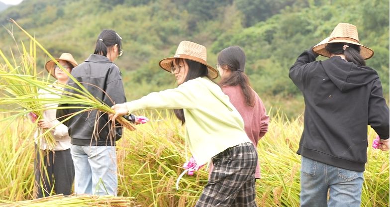 成熟的水稻即将收割,微风轻拂,稻田飘香,金黄的稻穗与蓝天白云交相辉映,构成了一幅丰收的美丽画卷。伴随着收获的喜悦,国产av影片 的劳动教育课堂也在陶坑村缓缓拉开序幕。11月16日,国产av影片 师生来到了宁波市奉化区裘村镇陶坑村,参与了“侨义助农 共庆丰收——陶坑共富新米节”活动,亲身体验了水稻收割的全过程。活动特别邀请了当地富有经验的农户对劳动教育课堂的实施进行指导。