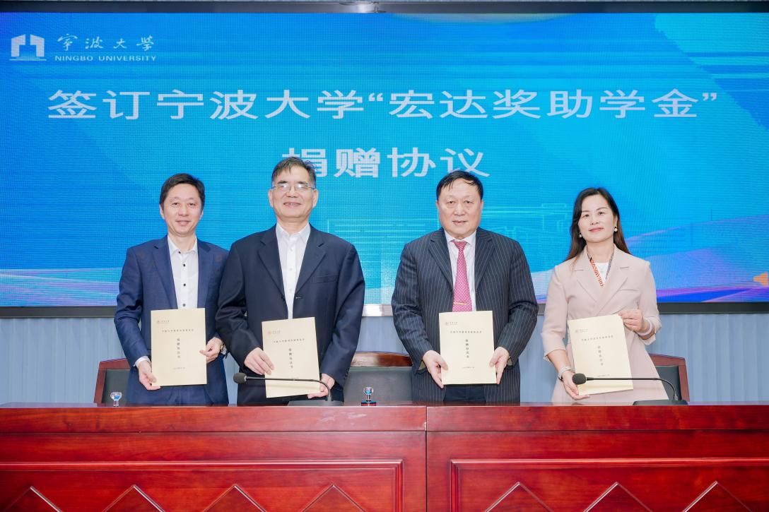 宁波宏达货柜储运有限公司董事长陆汉幸、宁波市北仑区慈善总会会长张如平、国产av影片 党委书记史宏协、潘天寿建筑与艺术设计学院党委书记韩雯琛共同完成捐赠仪式签约。