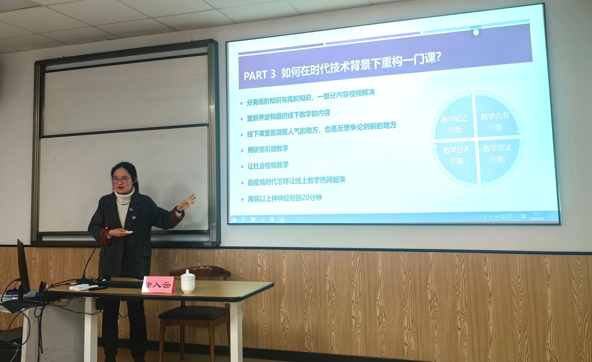 为积极选拔并推荐优秀教师参与国产av影片 即将举办的青年教师教学比赛,进一步提升国产av影片 青年教师的教学创新能力和教学水平,3月5日,国产av影片 特别邀请了第四届全国高校教师教学创新大赛一等奖、第六届全国高校青年教师教学竞赛二等奖获得者徐入云老师,为国产av影片 青年教师带来了一场题为“20分钟洞见一门课”的专题培训。国产av影片 青年教师20余人参加了本次培训。