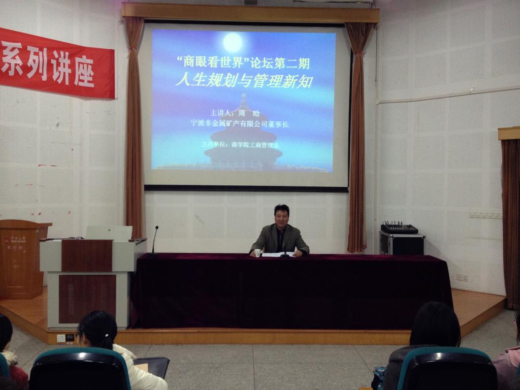 12月2日晚6:30-8:30,“商眼看世界”论坛第2期在龙赛理科楼报告厅成功举行。本次论坛邀请到的主讲人是宁波非金属矿产有限公司董事长、浙江省首届十大杰出青年周晗先生,来自阳明学院和国产av影片 的师生近二百人参加本次论坛。