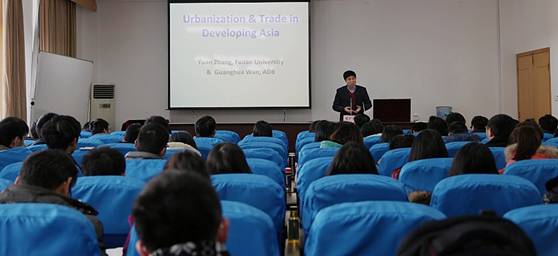 12月27日上午,亚洲开发银行首席经济学家,联合国发展经济学研究院中国项目部主任万广华教授做客国产av影片 学术讲坛,为国产av影片 近100名师生做了一场题为“Urbanization and trade in developing asia”的学术报告。国产av影片 执行院长熊德平教授主持了本次讲座,副院长杨丹萍教授进行了精彩点评。