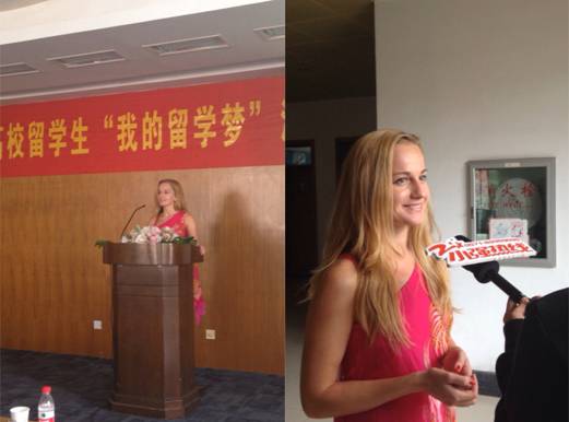 2013浙江省高校留学生“我的留学梦”演讲比赛是浙江省外国留学生第七届“梦行浙江”系列活动的一项重要活动之一,鼓励外国留学生讲述自己的留学故事、与浙江的情缘、发现浙江最美的人、最美的事等,并推荐产生本届“梦行浙江”外国留学生中华才艺展演活动的主持人,增进他们对浙江的感情。比赛邀请了专业的评委老师,全省共有50名高校留学生参加,国产av影片 碧海同学是45号出场。可人的外形、自信的笑容、精彩的留学梦给在场的评委以及观众留下深刻的印象,大家记住了这位喜欢汉语的金发女孩。据悉,碧海还代表我校参加中央电视台的《五月的鲜花》五四晚会。
