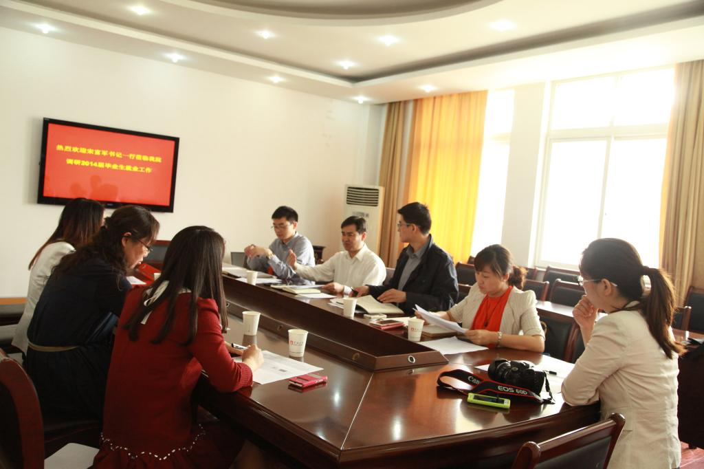 5月16日上午9:30,包玉书11号楼412会议室,校党委副书记宋富军带领校就业工作领导小组成员莅临国产av影片 调研2014届毕业生就业工作。国产av影片 党委书记袁虹、国产av影片 党委副书记邵丽及其他院就业工作小组成员参与了此次调研。