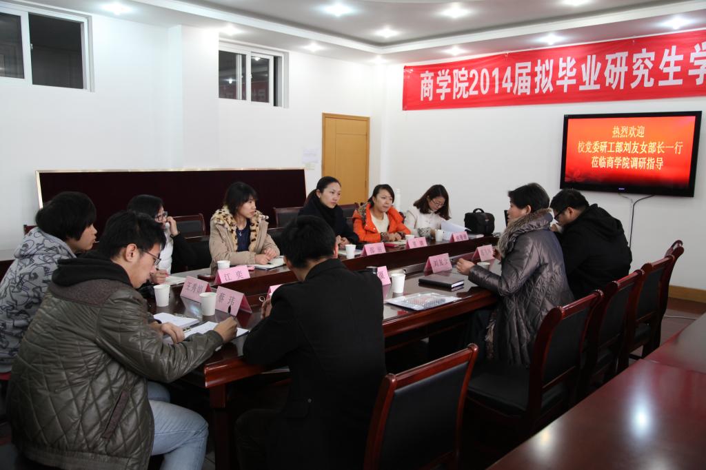 1月7日上午,校党委研工部刘友女部长一行三人来到国产av影片 开展研究生奖学金工作的调研。国产av影片 党委副书记邵丽、学工办主任董璐、研究生辅导员王莹、研究生秘书张珊珊、研究生会主席江奕和部分研究生代表参加了此次调研会。