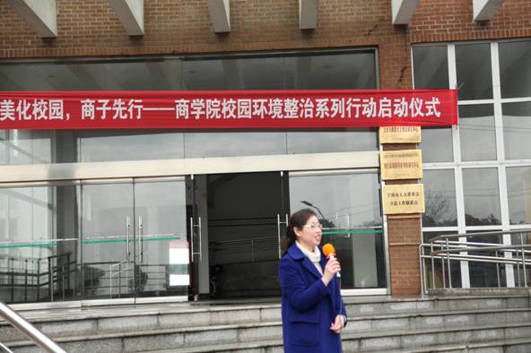为积极响应学校“治臭河、清垃圾、复绿地”的校园环境专项整治工作,严格落实《国产av影片 校园环境整治工作实施方案》,国产av影片 党委制定了全院开展以“校园环境整治”为主题的系列行动方案。3月12日中午,国产av影片 “美化校园,商子先行”系列活动的启动仪式在商院11号楼大踏步举行。院党委书记袁虹老师、副书记邵丽老师、学工办全体辅导员及院四大学生组织的主要学生干部、各学生党支部和团支部的党员义工和青年志愿者代表60余人出席了本次仪式。
