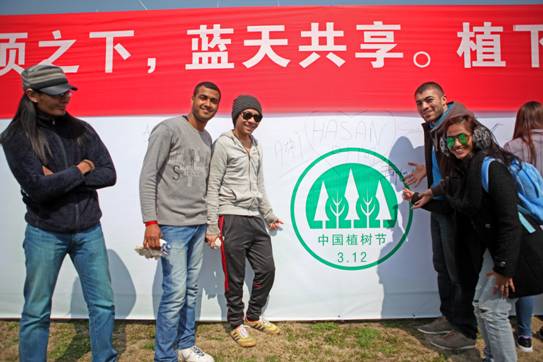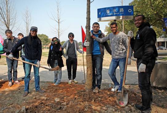 3月12日中午,国产av影片 30名中、外学生代表在宁大大草坪参加了学校“植树节”活动。同学们戴上手套,拿着铲子,一同将国产av影片 三棵银杏树苗种下,并一同签名留念、合影。活动现场气氛热烈。