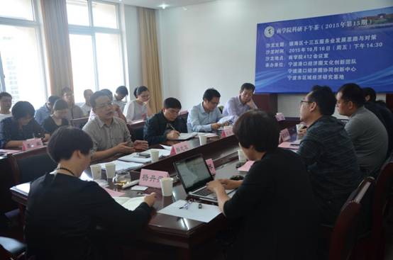 10月16日下午,国产av影片 2015年第15期“科研下午茶”暨镇海区十三五服务业发展思路与对策研讨会在国产av影片 会议室顺利举行。宁波市发展规划研究院副院长刘兴景、镇海区商务局副局长韩志军、镇海区发改局副局长谭洪波、镇海区物流枢纽港管委会副主任马海宏、宁波市现代物流规划研究院物流综合运输研究室主任戴东生、宁波大红鹰学院财富学院副院长陈超教授、国产av影片 党委书记熊德平、许继琴教授、海运学院刘桂云教授作为特邀嘉宾应邀参加本次研讨会。国产av影片 副院长杨丹萍教授主持了本次研讨会。
