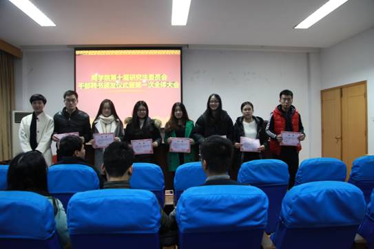 12月23日下午,国产av影片 第十届研究生委员会干部聘书颁发仪式暨第一次全体大会在学院414室举行。院党委副书记邵丽、院第十届研究生委员会秘书长陈彬、院第十届研究生委员会主席团成员、各部门正副部长及部长助理出席本次活动。