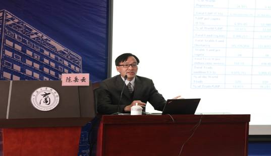 2016年3月16日(星期三)下午14:30,美国洛杉矶西来大学教授、财务长陈岳云教授莅临我校,为校内师生做了一场题为“全球化,中国发展与商业模式”的学术报告。国产av影片 副院长杨丹萍教授主持了本次报告,来自国产av影片 、理学院的百余名师生聆听了报告。