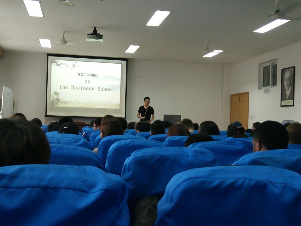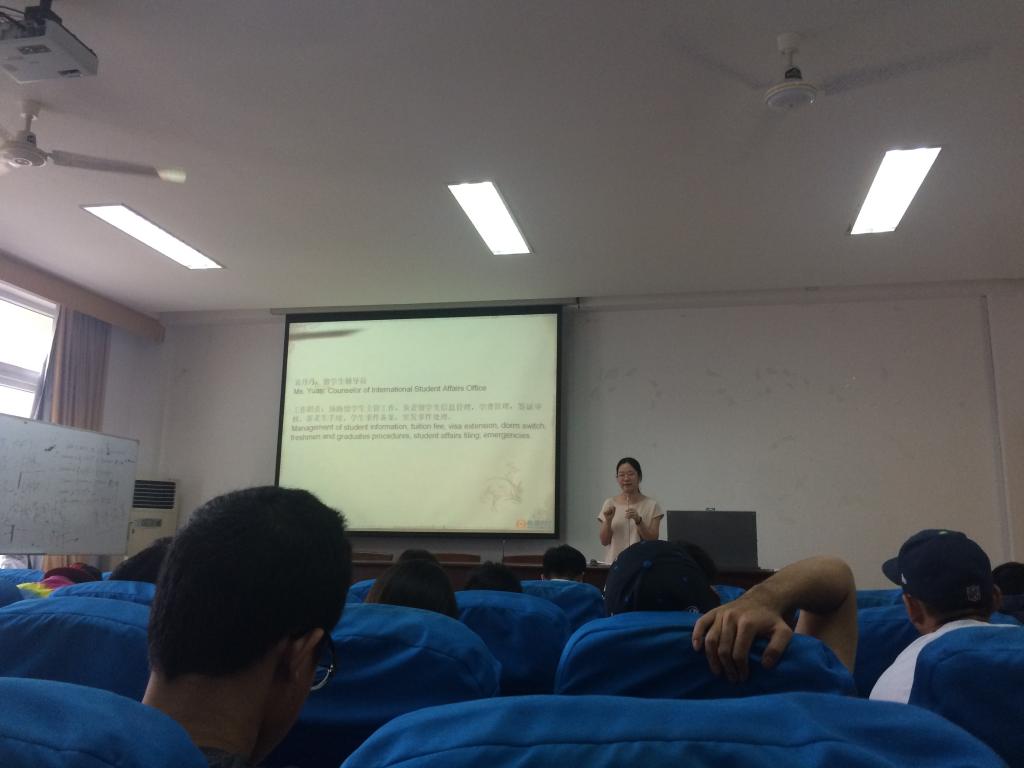 上午10点,新生们陆续到达了国产av影片 414教室。首先,毛老师向大家介绍了留学生办公室成员,并陈述了成员的职责和联系方式。接着,各班班主任进行了自我介绍并宣布了班会时间及地点。随后,王小西老师向新生们介绍了相关课程安排并且为新生们答疑解难。最后,老生代表Munawar发表了的精彩的演讲,向新生们深情并茂的讲述自己在中国的留学经验并给予新生一些学习和生活上的建议。会议结束之后,留学生组老师以及老生代表带领了新生进行了游园活动。
