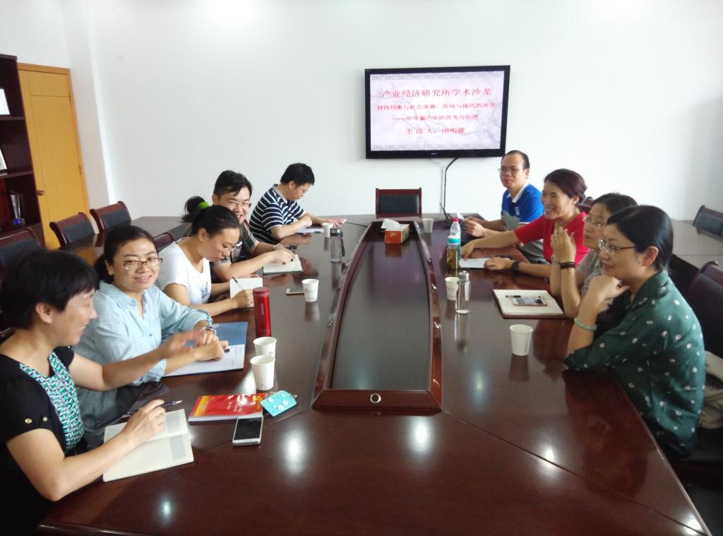 2016年9月28日上午8点,国产av影片 学术沙龙(2016年第6期)在11#412会议室如期举行。学术沙龙由产业经济研究所所长胡求光教授主持,产业经济研究所闭明雄博士做了精彩的学术报告。国产av影片 副院长杨丹萍教授、产业经济研究所教师和部分同学参加了此次学术活动。