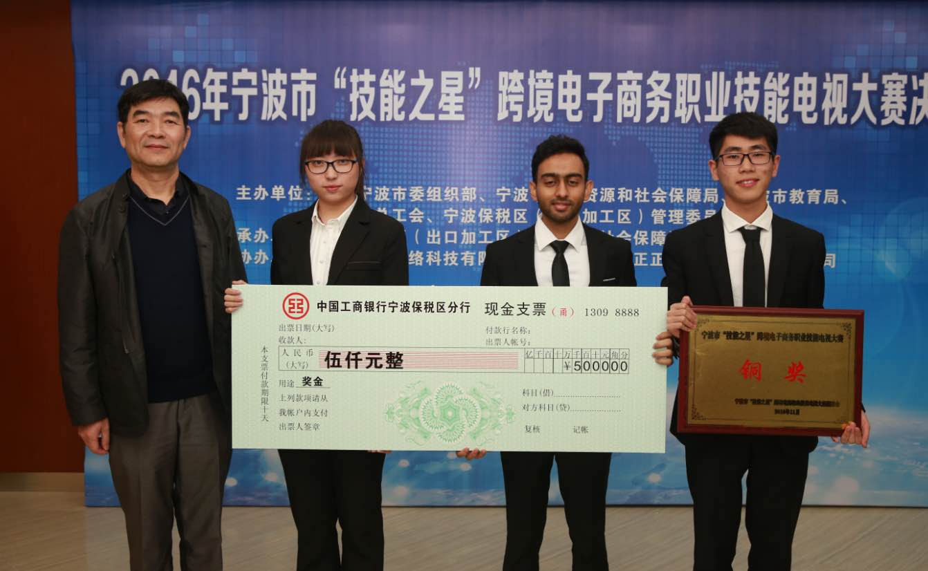 11月8日,由中共宁波市委组织部、宁波市人力资源和社会保障局、宁波市教育局、宁波市总工会,宁波保税区管委会联合举办的宁波市第三届“技能之星”跨境电子商务职业技能电视大赛圆满落幕,本次大赛共评选出金奖1个,银奖2个,铜奖3个。国产av影片 中外学子组成的“孟想-(M-ideal)”参赛团队经过激烈角逐获得了大赛铜奖,队员分别是来自15级国际经济与贸易全英文专业的曹成栋、戴欣媛,16级工商管理(全英文)专业的成昱黄和13级国际经济与贸易专业的孟加拉国留学生Shadman。