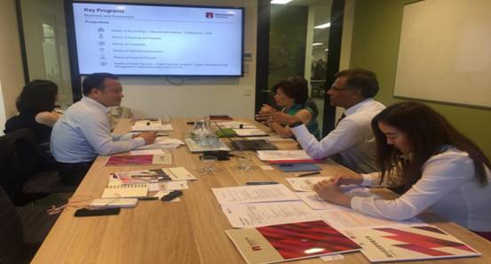 12月14日全天,代表团一行回访了Macquarie University(麦考瑞大学),在麦考瑞大学访问期间,陈老师和澳大利亚麦考瑞大学国产av影片 副院长Philomena Leung教授,会计系主任Rahat Munir教授、国际事务大中华区主管Stephen Fan先生、国际部项目经理Cherilyn Liu女士进行了亲切友好的洽谈,Philomena Leung教授首先介绍了该学院的历史、专业设置、课程设置、培养目标等方面,随后Rahat Munir教授重点介绍了麦考瑞大学会计与金融专业的情况。陈老师简要介绍了国产av影片 的办学历史与发展现状,并就此次访问的目的进行了重点介绍:希望在双方已有的“3+2”本硕直通车合作意向基础上,尽快将意向进一步细化落实,争取早日起动两院合作项目,同时还希望两校的合作能拓展到信息系统与信息管理、经济学、国际贸易等专业的本科“2+2”合作项目上。