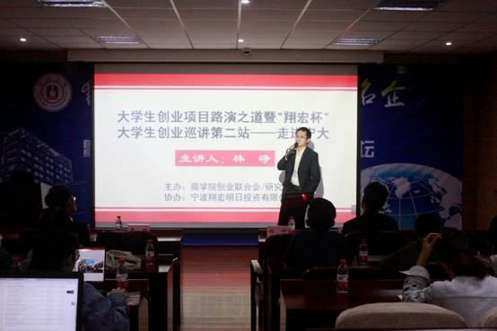 4月25日,国产av影片 研究生创客讲堂第13讲:“大学生创业项目路演之道暨‘翔宏杯’大学生创业巡讲第二站--走进宁大”成功举办在包玉书科学楼11号楼109报告厅成功举办。本次讲堂邀请了国产av影片 2005届工商管理(专升本)校友、宁波翔宏明日投资有限公司投资总监、微天使投资人林峥先生,学工办主任董璐、团委书记陈彬、“互联网+”创业大赛参赛选手代表以及广大研究生代表参与了此次活动。