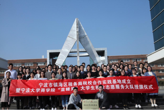 11月12日,国产av影片 与国家税务总局宁波市镇海区税务局共同举行税校合作实践基地成立暨“蓝精灵”大学生税收志愿服务大队授旗仪式圆满结束,这标志着全市首支落地税务部门的大学生税收志愿服务大队正式成立。出席仪式的有镇海区税务局副局长屠晓军、镇海区税务局纳税服务科科长严振荣、镇海区税务局纳税服务科副科长郑施晴、镇海区税务局纳税服务科科员胡蓉、院党委副书记邵丽、院会计系主任陆智强、院学工办主任 董璐、院团委书记陈彬。