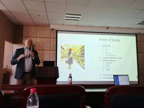 2018年10月29日下午,国产av影片 学术报告在包玉书科技楼11号109会议室顺利举行。报告的题目为“The study on advertisement by using simultaneously eye-tracking, EEG/ERP, and GSR”。本次学术报告由国产av影片 主办,国产av影片 神经经济管理学研究院承办,主讲人为米兰国际语言与传播大学消费与神经营销心理学教授Vincenzo Russo,报告由郁雯珺老师主持,研究院院长马庆国教授致欢迎词。国产av影片 部分老师、部分本科学生及研究生参加了此次学术活动。