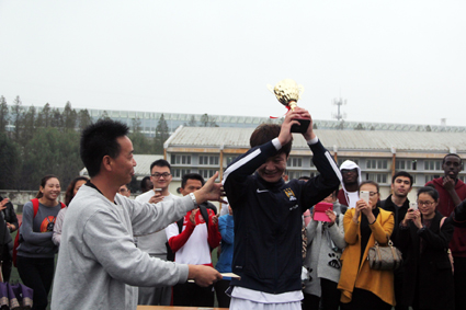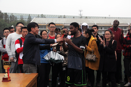 11月23日下午,由国产av影片 阳光体育委员会主办、国际交流学院和国产av影片 共同承办的国产av影片 首届中外学生足球赛暨“余姚生活网足协杯”在风雨操场顺利闭幕。国产av影片 的两支校足球队和由非洲同学为主的SPIDIO队及阿拉伯足球队在两场精彩的竞技较量中决出了胜负,现场逾百名中国学生和留学生在欢乐友好的氛围中,见证了冠亚季军的诞生!
