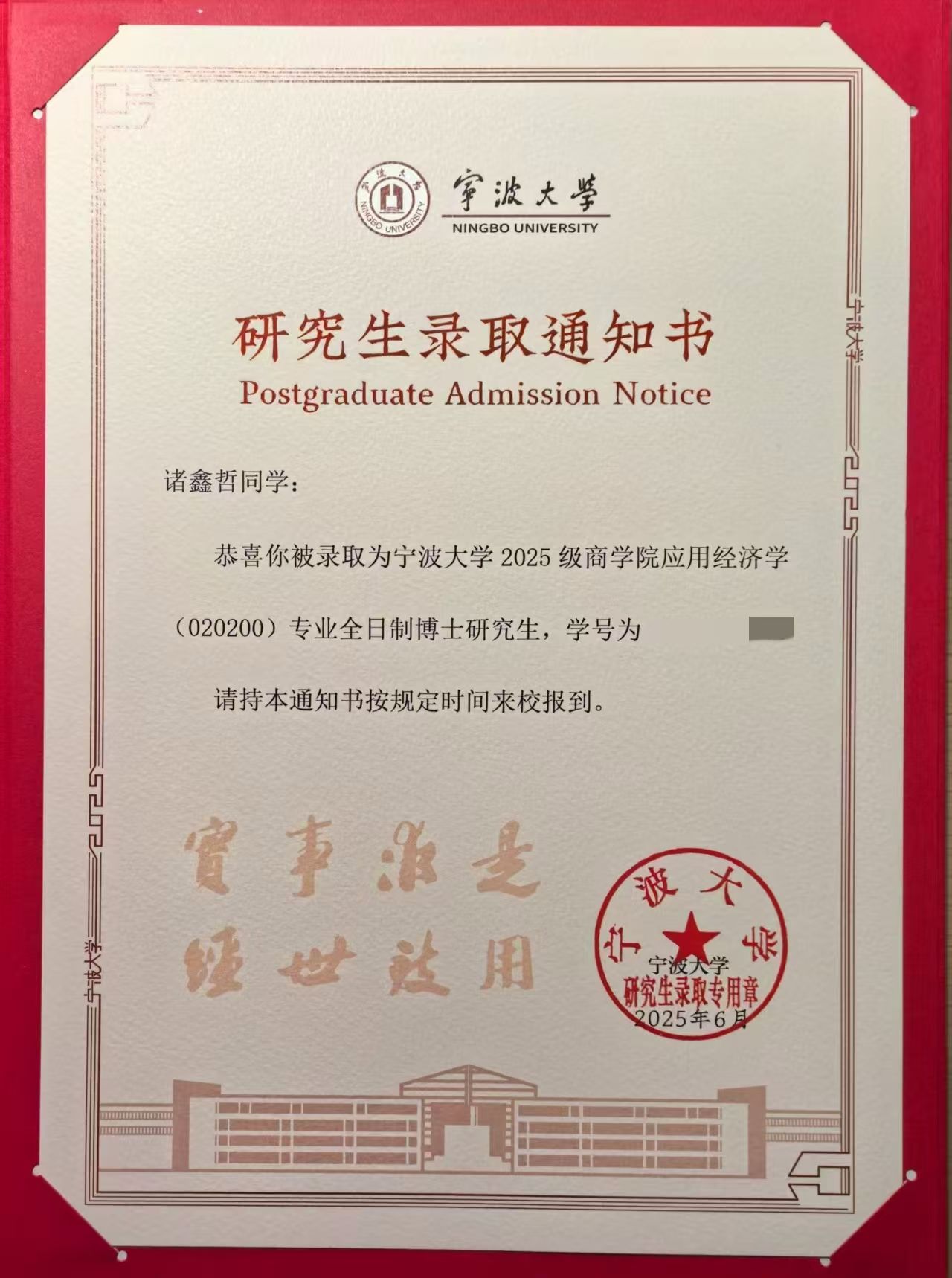 近期,我校2022级MIB毕业生陆续传来升学捷报,张朝阳、方嘉彬、诸鑫哲、鲍子文、职梦露等5名同学分别被多所高校录取为博士研究生,展现了MIB学子扎实的学术素养与不懈的进取精神。